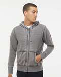 J-America Adult Vintage Zen Fleece FZ Hood. 7.0 oz. 55% Cotton, 45% Polyester Burnout fabric. Acid washed with silicone finish. Flatlock stitching details . throughout. Dyed to match drawcords. Raw edges on all seams. Antique Brass concealed zipper. Front pouch pocket.